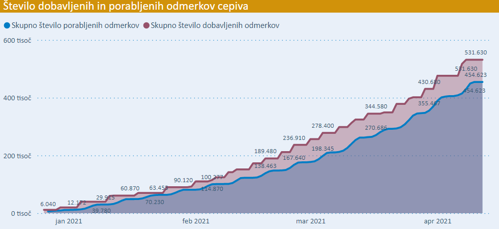 - pri Moderni razlika zaradi 4600 odmerkov, ki so bili distribuirani 6. in 7. aprila, in zaradi manjše zaloge cepiva na inštitutu, nekaj cepiva ostaja na cepilnih mestih;