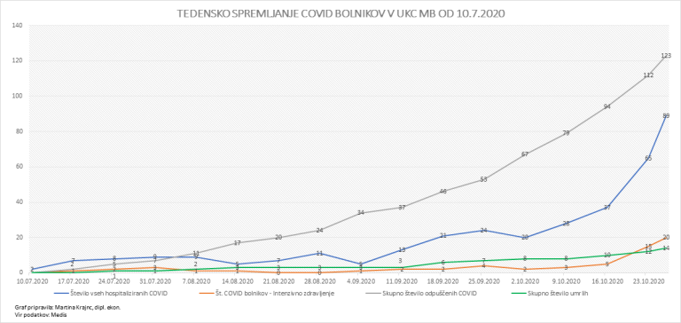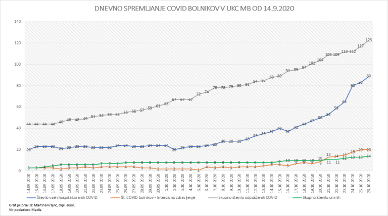 Iz Univerzitetnega kliničnega centra Maribor pošiljajo grafični prikaz stanja covid bolnikov v Univerzitetnem kliničnem centru Maribor za obdobje od 14. septembra do 26. oktobra in tedenski prikaz stanja za obdobje od 10. julija do 23. oktobra.