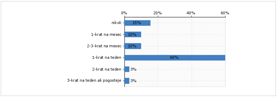 Nacionalni inštitut za javno zdravje je zanimalo tudi, kako pogosto v zavodih ponujajo obroke brez mesa. Več kot polovica zavodov, okoli 60 odstotkov, je najmanj enkrat tedensko ponujala brezmesni dan, kot svetujejo smernice, 10 odstotkov šol in vrtcev je brezmesni dan na jedilnik uvrstila enkrat na mesec in 10 odstotkov zavodov le dva- do trikrat mesečno.
