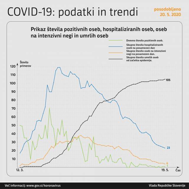 Včeraj je umrla ena oseba, okužena s koronavirusom. Skupno število umrlih zaradi covid-19 v Sloveniji tako znaša 105.