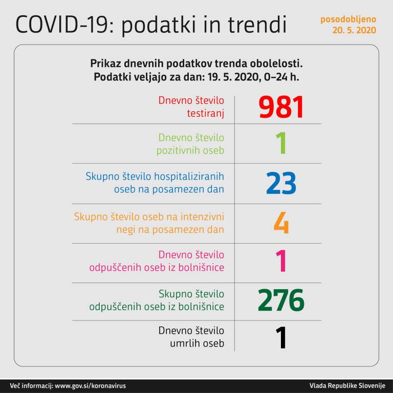 Po zadnjih podatkih, ki jih je sporočil državni vrh, je bilo včeraj v štirindvajsetih urah opravljenih 981 testiranj, od tega je bila ena oseba pozitivna na koronavirus. Doslej smo v Sloveniji zabeležili 1468 primerov koronavirusa.