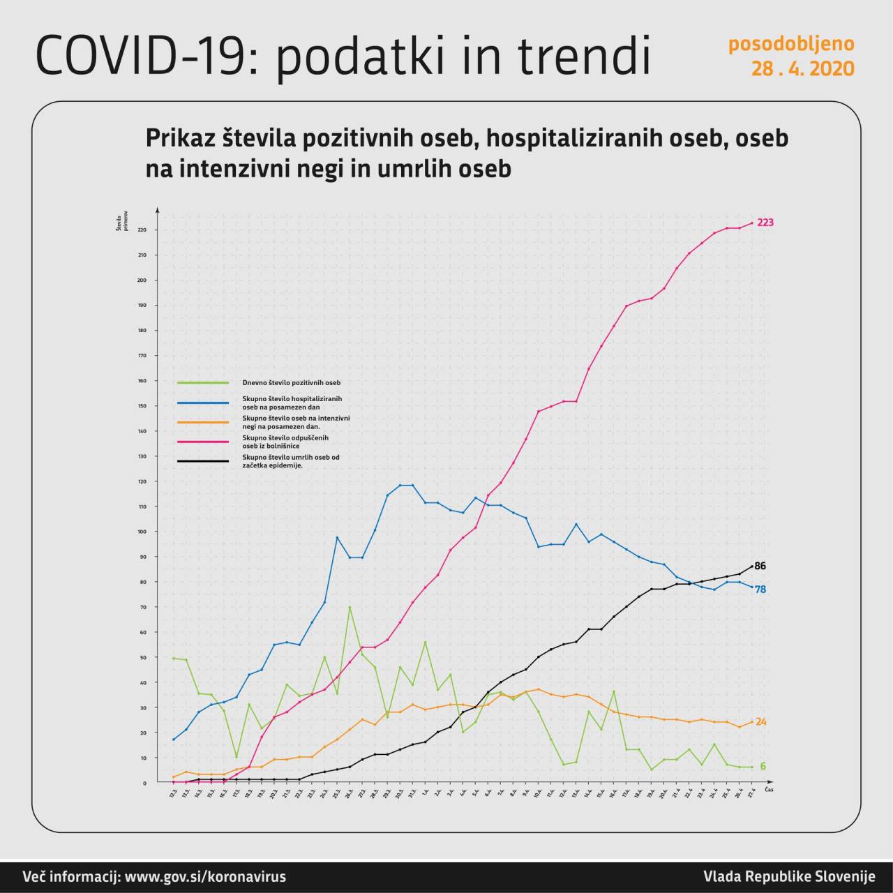 V bolnišnicah je trenutno zaradi koronavirusa 78 hospitaliziranih oseb, od tega jih je 24 na intenzivni negi. Iz bolnišnice sta bili odpuščeni dve osebi.