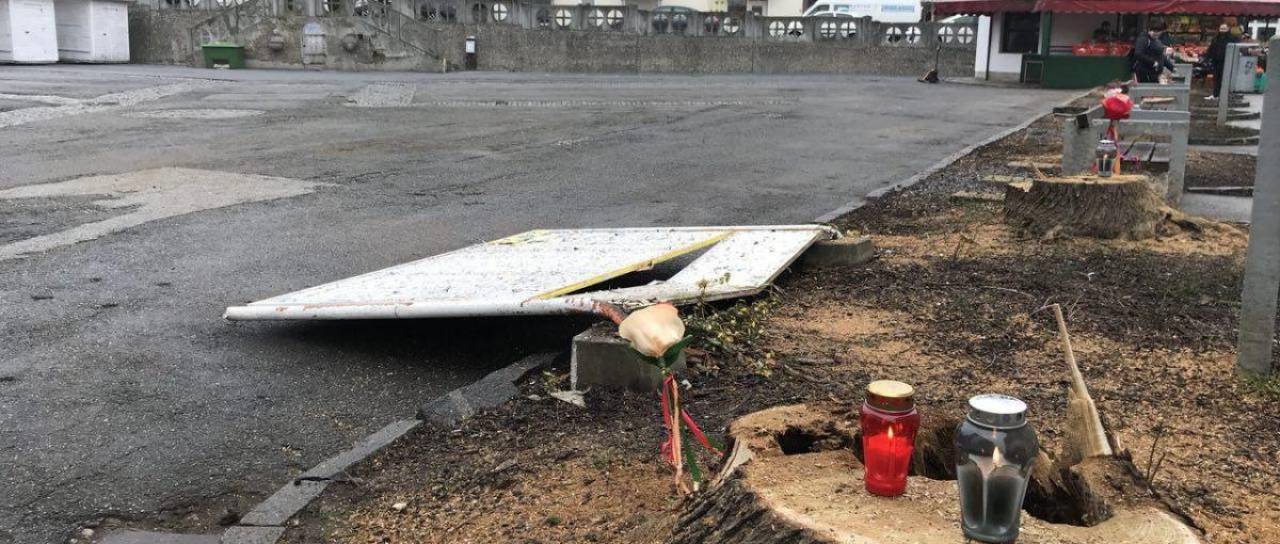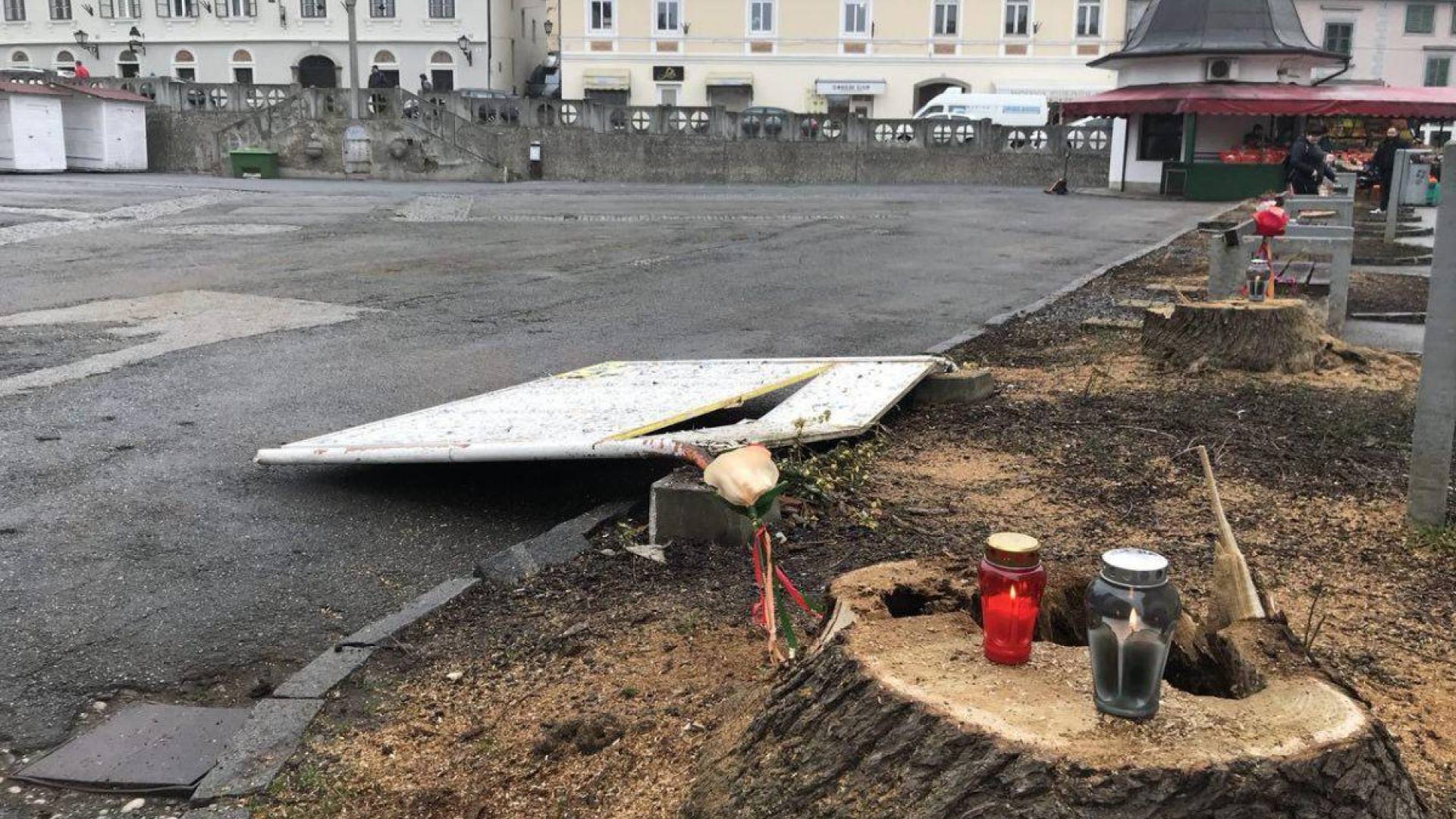 Med podiranjem dreves je padel tudi pano za plakate, ostal pa transparent z načrti za prenovo tržnice. Ta je vredna skoraj 5 milijonov evrov in predvideva zasaditev 14-ih novih dreves. A vseh Ptujčanov načrti niso prepričali, zato so tudi na stopnicah mestne hiše zagorele sveče.