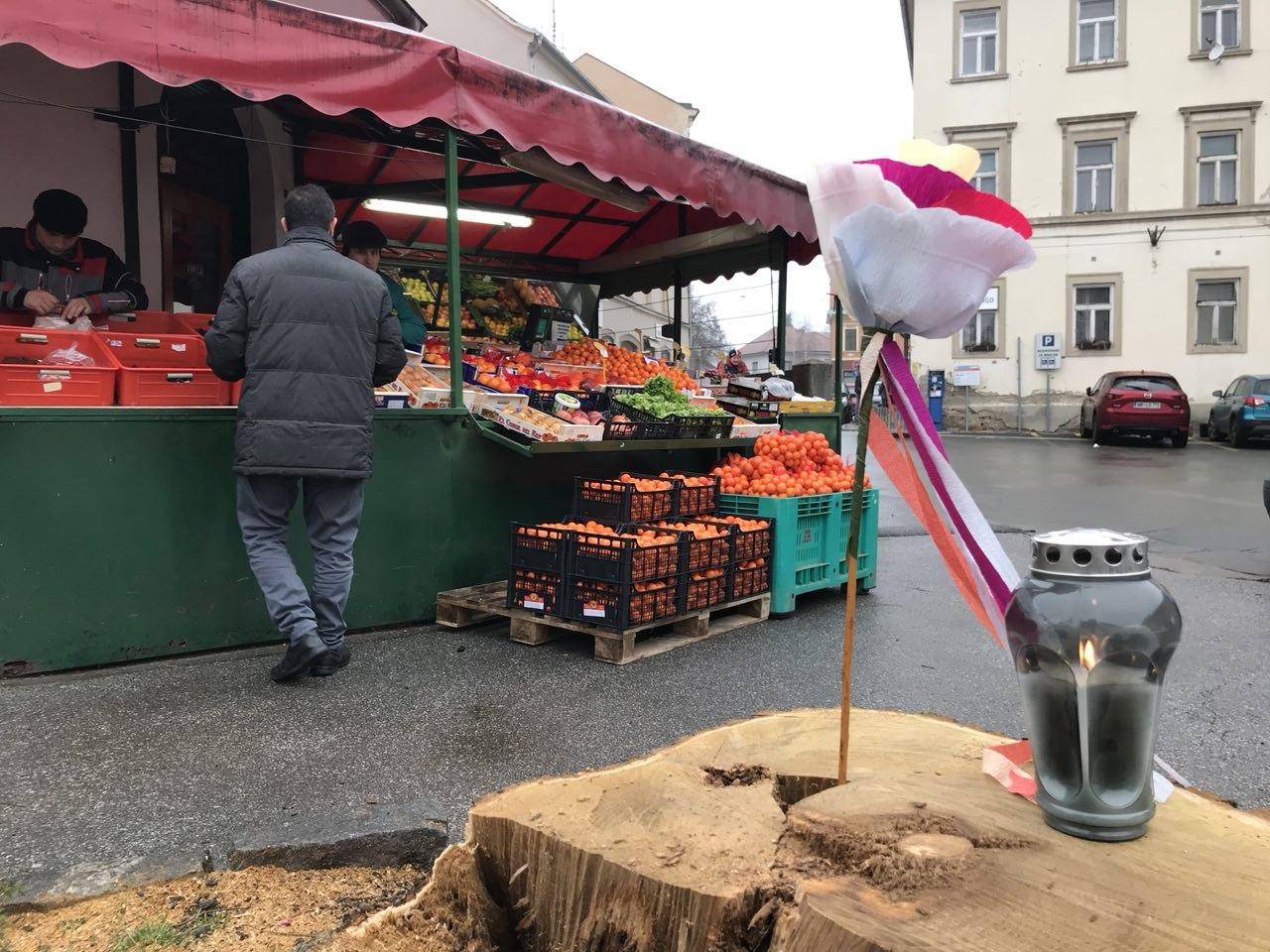 Musap Ziberi, ki že 41 let na tržnici prodaja sadje, je bil presenečen, da ga o pravi drvarski akciji ni nihče obvestil. Povedal je, da so pričeli ob 7.19, deset minut kasneje pa so bila podrta že vsa drevesa. Tudi Ziberi je prižgal svečo na porezanem štoru.