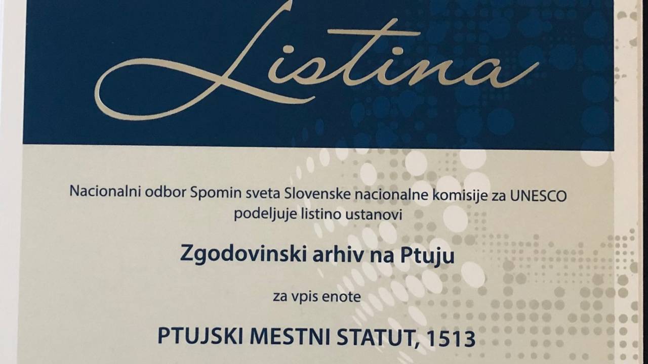 Zgodovinski arhiv na Ptuju se je s Statutom iz leta 1513 vpisal na Nacionalno listo Spomin sveta.