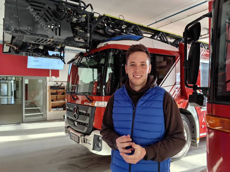 Za fotografijo je moral z gasilsko lestvijo visoko v zrak, kar ga je pustilo nasmejanega, čeprav priznava: »Malo so me noge pekle.«
