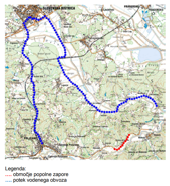 Obvoz bo v času popolne zapore urejen po državnih cestah na relaciji R1-219 odsek 1236 Slovenska Bistrica–Poljčane, R2-430 odsek 0275 Slovenska Bistrica, R2-430 odsek 0522 Priključna cesta Slovenska Bistrica ter lokalna cesta Slovenska Bistrica–Pečke in obratno.