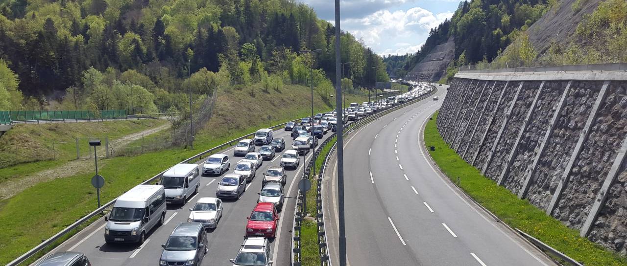 Lepo vreme privablja tudi dnevne izletnike, promet se vse bolj gosti. Na Gruškovju že šest do sedemkilometrski zastoj.