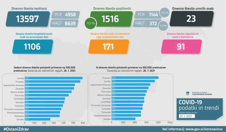 V Sloveniji so včeraj, 27. januarja, opravili 13.597 testiranj na koronavirus in potrdili 1516 novih okužb, gre za 11,1-odstotni delež.