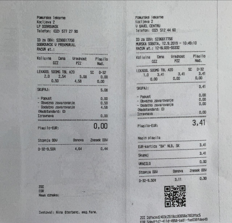 Iz priložene fotografije je razvidno, koliko v primeru nakupa Lekadola na recept lekarnam – v tem primeru konkretno Pomurskim lekarnam – priznata Zavod za zdravstveno zavarovanje Slovenije in zavarovalnica dodatnega zavarovanja (levo) ter koliko omenjeno zdravilo stane v prosti prodaji (desno). Upoštevati seveda moramo, da se prvi račun nanaša na izdajo dveh škatlic.