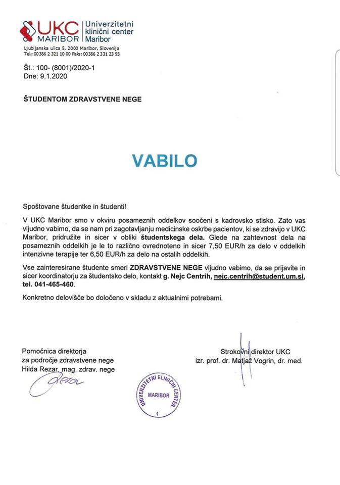 Na družbenih omrežjih je zaokrožilo sporočilo Univerzitetnega kliničnega centra Maribor, namenjeno predvsem študentom zdravstvene nege, pod katerega sta podpisana pomočnica direktorja za področje zdravstvene nege Hilda Rezar in strokovni direktor UKC Maribor Matjaž Vogrin.