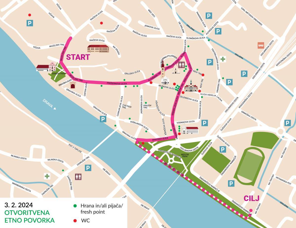 Muzejski trg – Prešernova ulica – Slovenski trg– Slomškova ulica – tržnica– Miklošičeva ulica – Mestni trg – Krempljeva ulica – Minoritski trg – Miheličeva galerija - Karnevalska dvorana, dvorana Campus Sava Ptuj.