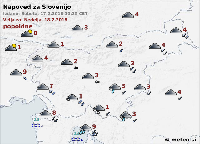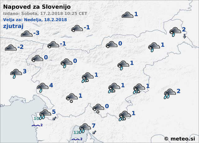 Jutri čez dan bodo padavine od severa postopno oslabele in večinoma ponehale. Na Primorskem bo deževalo, drugod večinoma snežilo. Zapihal bo severovzhodni veter, na Primorskem šibka do zmerna burja. Najnižje jutranje temperature bodo okoli 0, na Primorskem okoli 5, najvišje dnevne od 1 do 4, na Primorskem okoli 8 stopinj Celzija.