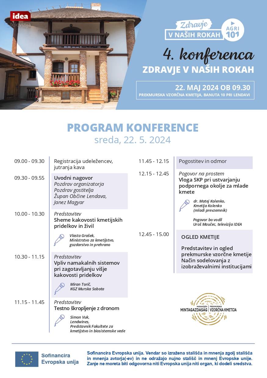4. konferenca Zdravje v naših rokah bo v sredo, 22. maja 2024, ob 9.30, na prekmurski vzorčni kmetiji v Banuti v bližini Lendave.