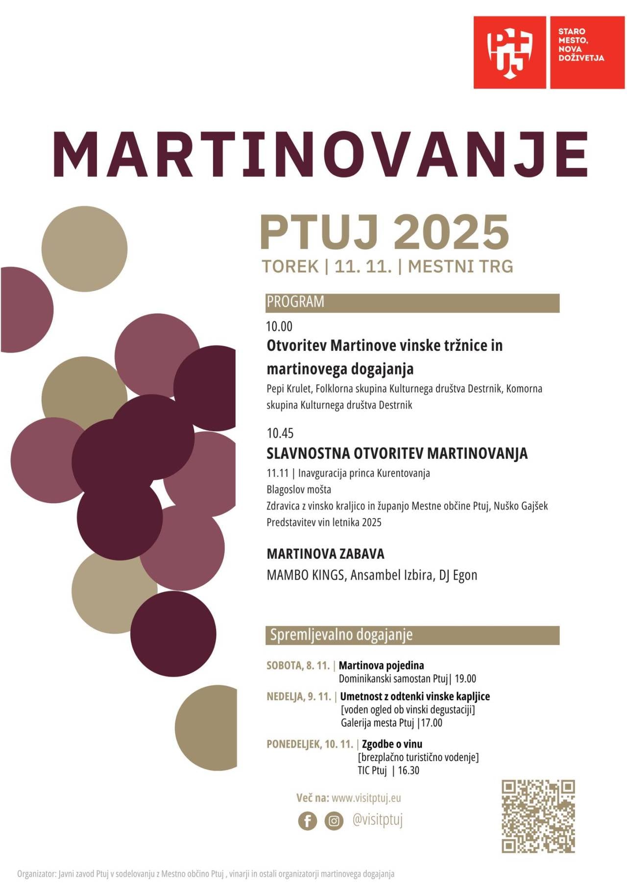 Martinovanje na Ptuju tako znova obeta bogat program, ki združuje kulturne, kulinarične in vinske vsebine ter bo staro mesto za nekaj dni spremenil v prestolnico veseljačenja in praznovanja nove vinske letine.