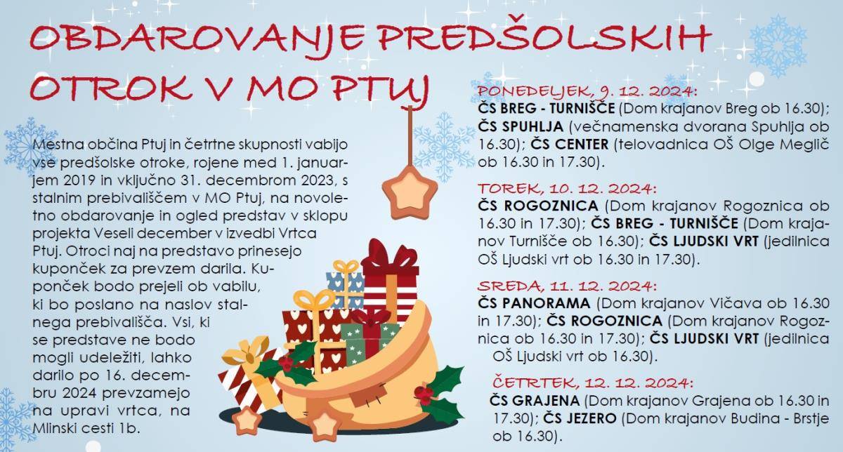 Skupaj s četrtnimi skupnostmi vabijo vse predšolske otroke, rojene med 1. januarjem 2019 in vključno 31. decembrom 2023, s stalnim prebivališčem v občini, na novoletno obdarovanje in ogled predstav v sklopu projekta Veseli december v izvedbi Vrtca Ptuj.