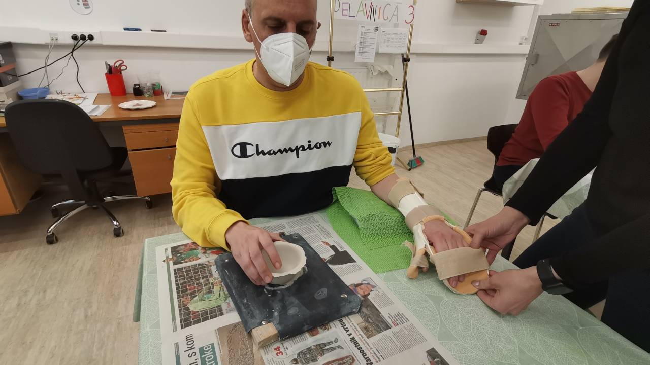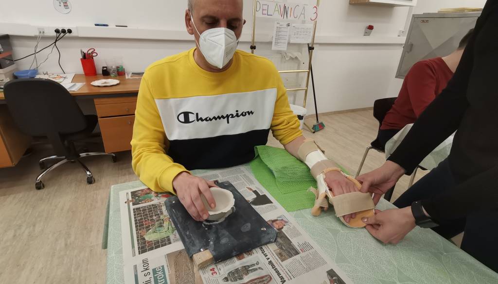 Za levo roko, ki je najbolj poškodovana, pa pri delu uporablja opornico.