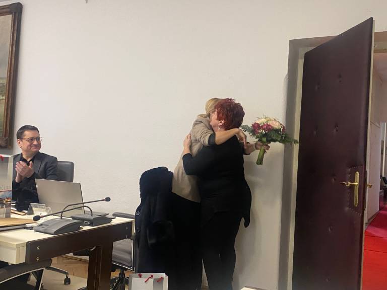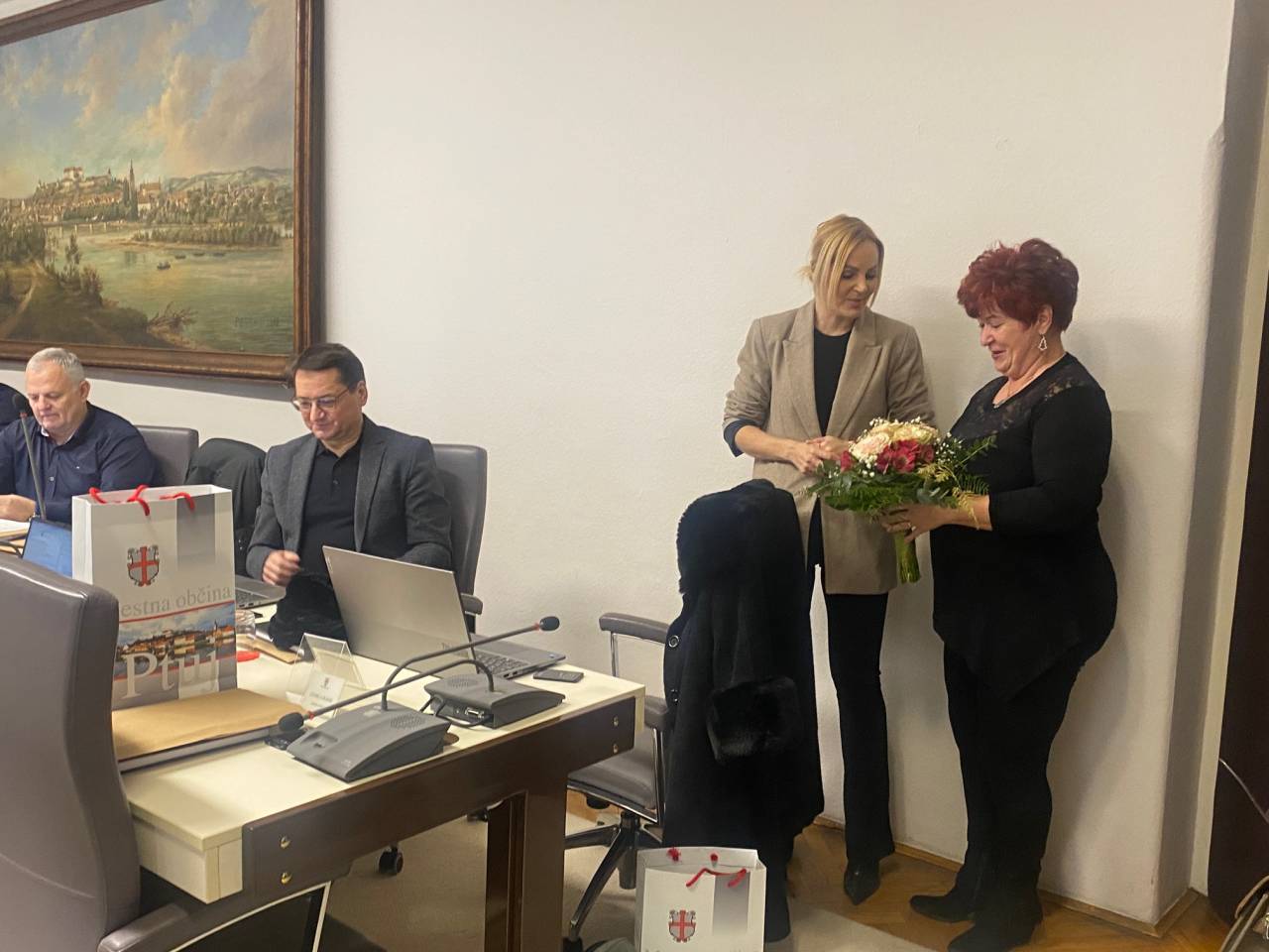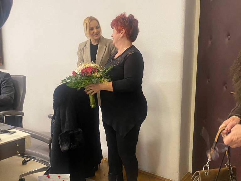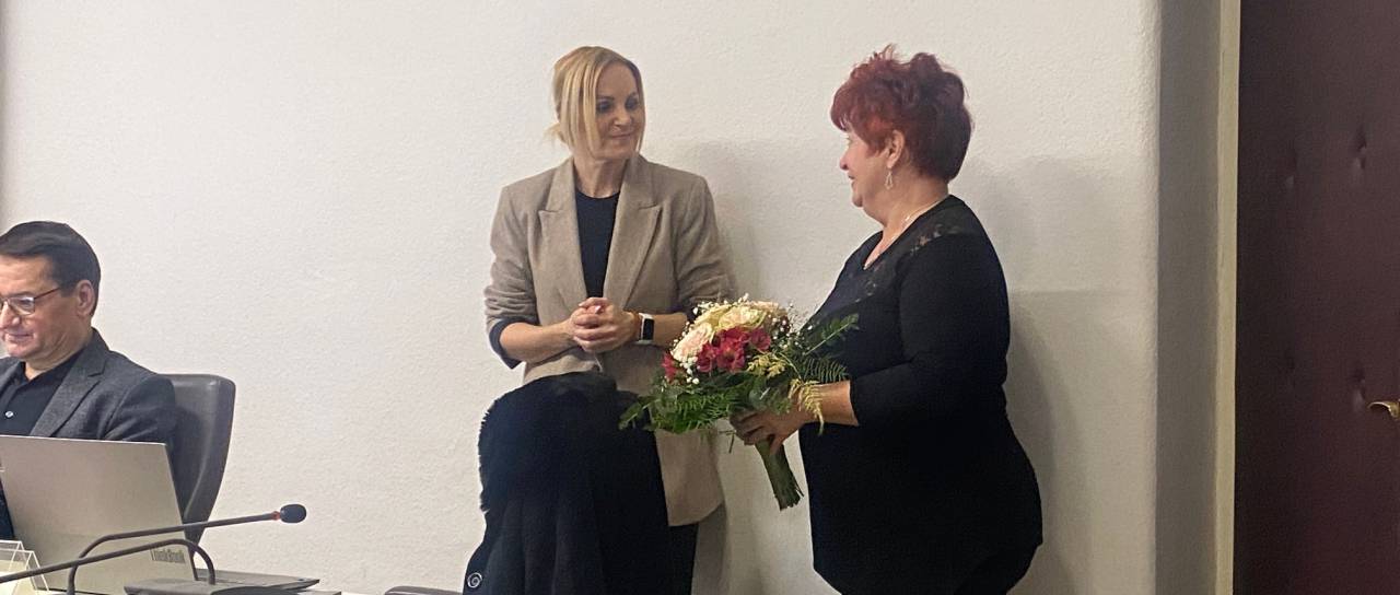 Pred včerajšnjo sejo Mestnega sveta Mestne občine Ptuj je županja Nuška Gajšek s šopkom rož presenetila nekdanjo dolgoletno direktorico Zdravstvenega doma Ptuj Metko Petek Uhan.