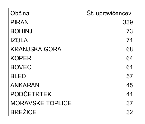 Največkrat so se odločili za bivanje v občini Piran, sledijo pa Bohinj, Izola, Kranjska Gora, Koper, Bovec, Bled in tako dalje.