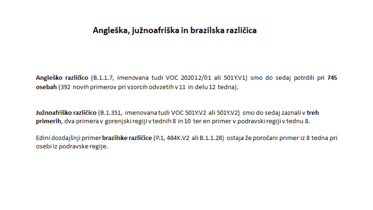 Angleško različico so potrdili do zdaj pri 745 osebah. Južnoafriško različico so do zdaj zaznali v treh primerih, brazilsko pa v enem, ta dva seva se pri nas ne širita, je pojasnila Tjaša Žohar Čretnik, direktorica Nacionalnega laboratorija za zdravje, okolje in hrano.