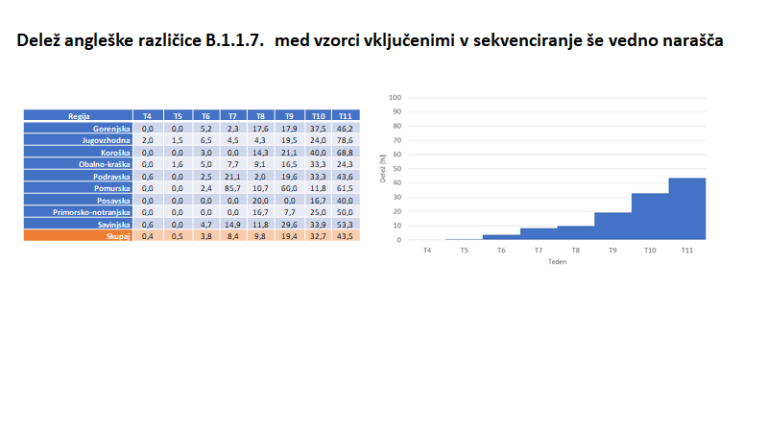»V zadnjem tednu delež angleške različice predstavlja že skoraj 42 odstotkov analiziranih vzorcev, kar pomeni, da uspešno izpodriva prej najbolj prisotno različico in poslabšuje epidemiološko sliko v Sloveniji. V zadnjem tednu smo odkrili devet različic virusa,« še pojasnjuje Žohar Čretnikova.