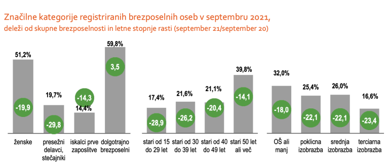 Ob koncu septembra je biloregistriranih 66.122 brezposelnih oseb, kar je 3170 oseb ali 4,6 odstotka manj kot avgusta, v primerjavi s septembrom 2020 pa je bila brezposelnost manjša za 17.644 oseb ali za 21,1 odstotka.