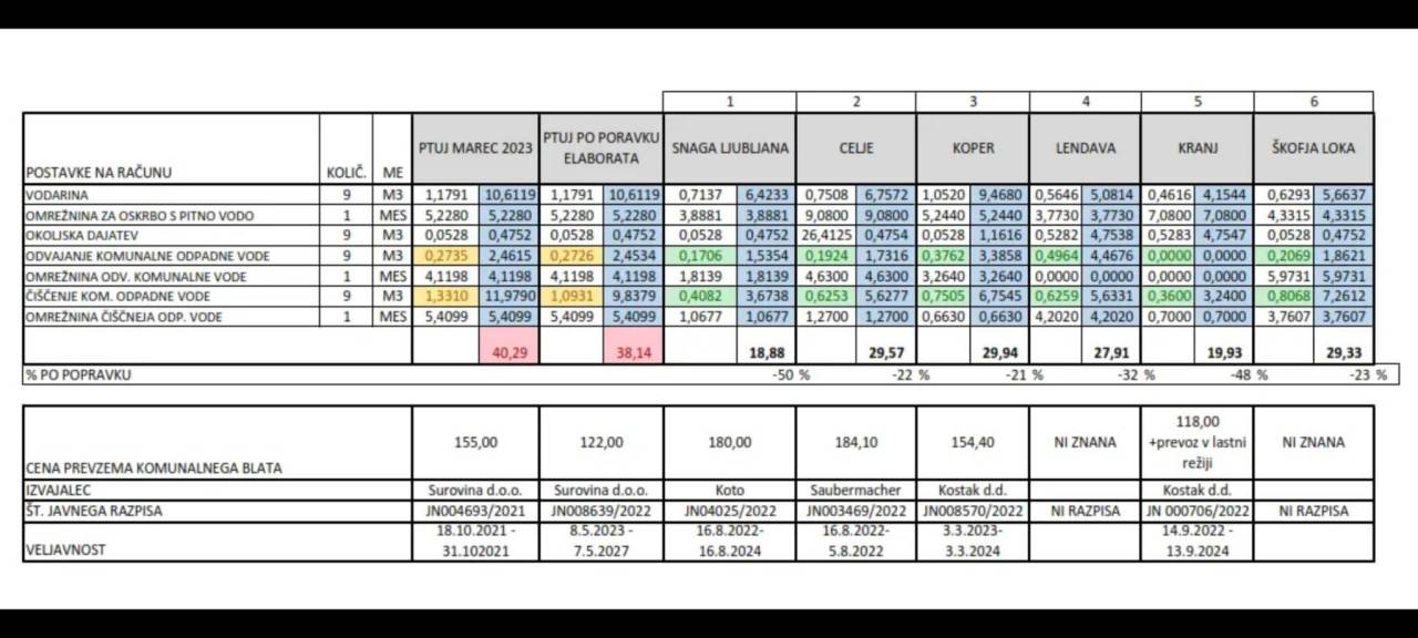 Sledi Koper, s ceno 29,94 evrov, pa Celje s ceno 29,57 evrov, Škofja Loka s ceno 29,33 evrov, Kranj s ceno 19,93 evrov in Ljubljana s ceno 18,88 evrov. Širec je podal na primerjavo odgovor, da komunalna podjetja po Sloveniji različno funkcionirajo, imajo tudi različne dejavnosti, zato primerjava, po mnenju Širca, ni na mestu.