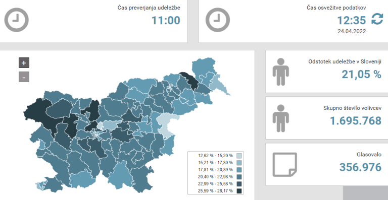 Do 11. ure je na voliščih glasovalo 356.976 volivcev oziroma 21,05 odstotka volilnih upravičencev. Najnižja volilna udeležba je zaenkrat v Mariboru, volilni okraj z najvišjo udeležbo pa Gornja Radgona.
