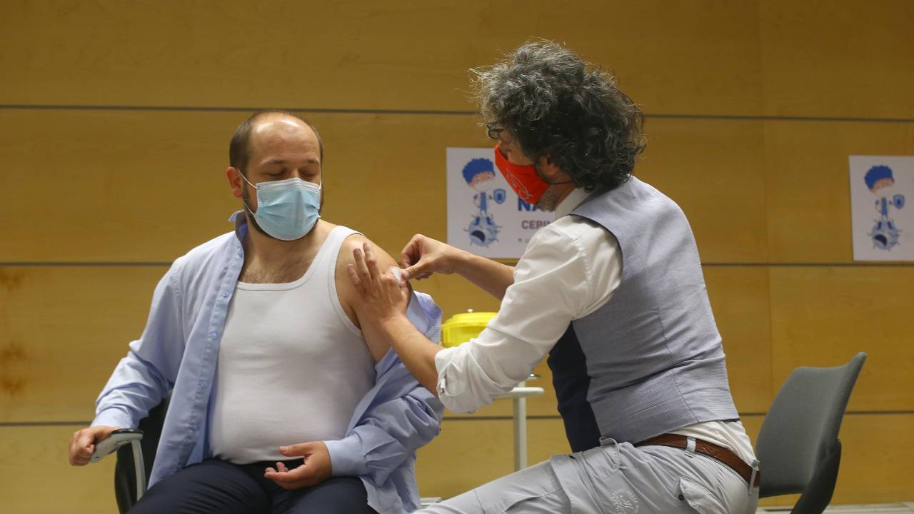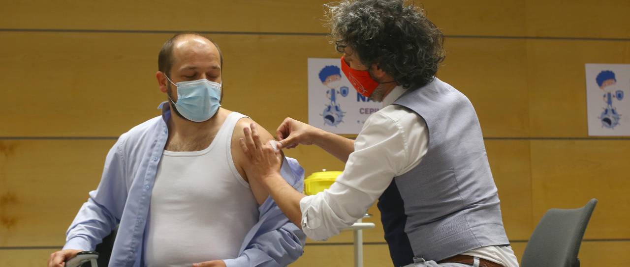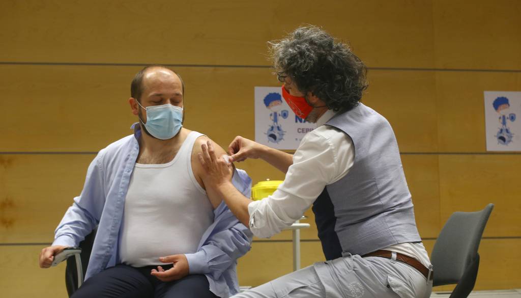 Minister za zdravje Janez Poklukar je danes zavihal rokav in dobil prvi odmerek cepiva AstraZeneca, z injekcijo pa je upravljal nihče drug kot prvi epidemiolog Mario Fafangel.