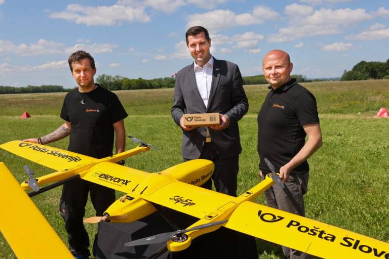 Pošta Slovenije je prvi poskusni let z brezpilotnim letalnikom izvedla v sodelovanju s slovenskim podjetjem OneDrone, ki je prvi slovenski operater brezpilotnih zrakoplovov najvišje kategorije in omogoča izvajanje letalskih operacij v najzahtevnejših pogojih ter z zagonskim podjetjem ElevonX, ki je proizvajalec brezpilotnih letal oziroma celotnih sistemov.