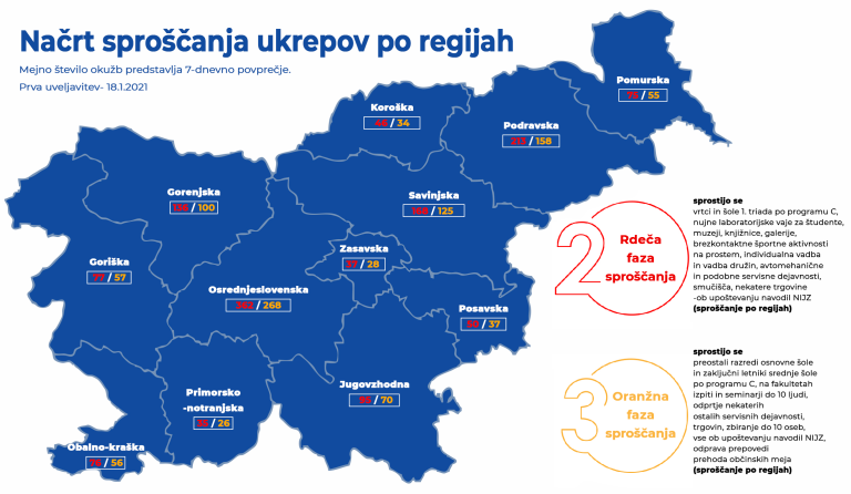 Za Pomurje je denimo za prvo fazo sproščanja potrebno doseči sedemdnevno povprečje števila okužb pri številu 75, v Podravju je to število 213. Za naslednjo fazo sproščanja, kjer sledi tudi odprtje občin, pa mora biti sedemdnevno povprečje v Pomurju 55, v Podravju pa 158. Trenutno je Pomurje pri številu 122,3, Podravje pa 225,6.