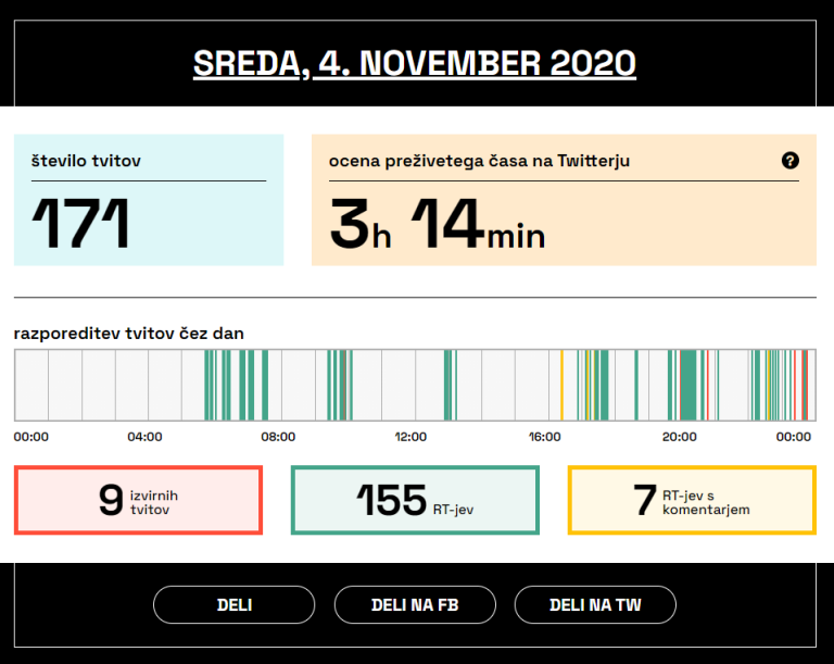 Če izračuni držijo, je Janez Janša v novembru na Twitterju preživel skupno skoraj 48 ur, kar bi lahko pretvorili v dva dvi. Najbolj dejaven je bil v sredo, 4. novembra, ko je na Twitterju preživel kar tri ure in 14 minut. Ta dan je objavil devet izvirnih tvitov, 155 ritvitov in sedem ritvitov s komentarjem. Če še izračunamo povprečje, je Janša v novembru na Twitterju v povprečju preživel okoli uro in pol.