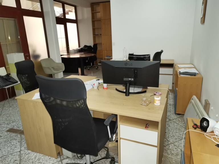 V pritličju stavbe so trenutno mize, ki so postavljene v prostor sodela, 'coworkinga'. V tem delu je tudi nekdanji frizerski salon, ki je opuščen zaradi odhoda v pokoj. Topolovec pove, da je za ta prostor že zanimanje.