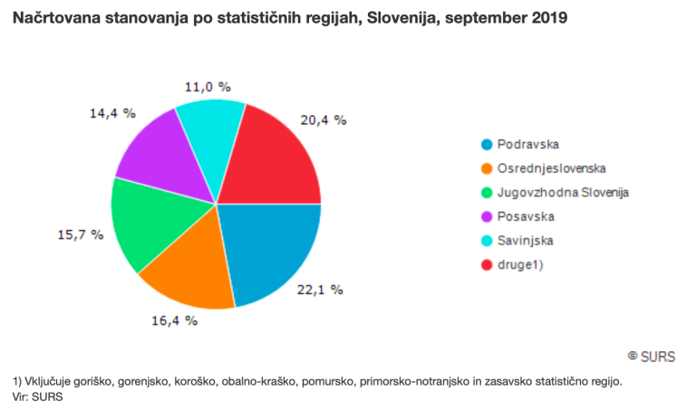 Sledita osrednjeslovenska statistična regija in jugovzhodna Slovenija; v prvi se bo gradilo 49, v drugi pa 47 stanovanj. V drugih statističnih regijah je z gradbenimi dovoljenji, izdanimi v septembru 2019, načrtovanih manj stanovanj, med temi najmanj v zasavski statistični regiji (2 stanovanji), medtem ko v koroški statistični regiji ni bilo načrtovanih stanovanj.