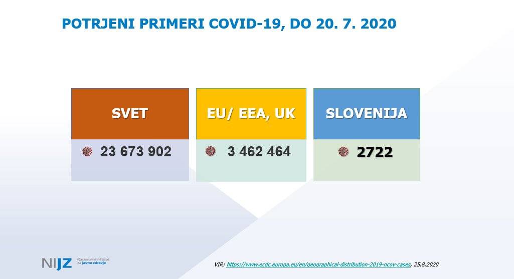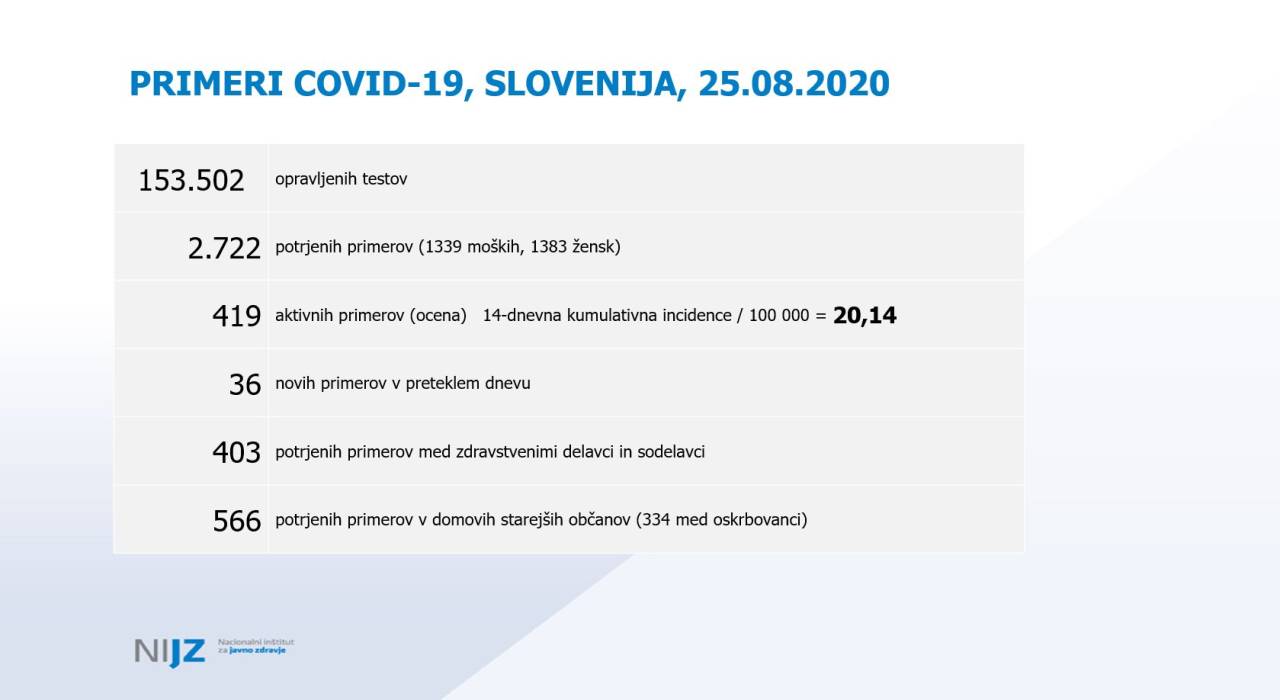 Nuška Čakš Jager z Nacionalnega inštituta za javno zdravje je predstavila trenutno epidemiološko sliko po svetu in pri nas. Ob tem je pohvalila, da imamo v Slovenijo visoko število opravljenih testov, kar nas uvršča na vrh evropskih držav, 14-dnevna kumulativna incidenca pa kaže, da imamo 20,14 okuženih na 100.000 prebivalcev. Med zdravstvenimi delavci okužbe ne naraščajo, je pa bila včeraj nova okužba potrjena pri varovanki doma starejših občanov. Trend okužb v zadnjem času je sicer nagnjen k mlajšim starostnim skupinam.
