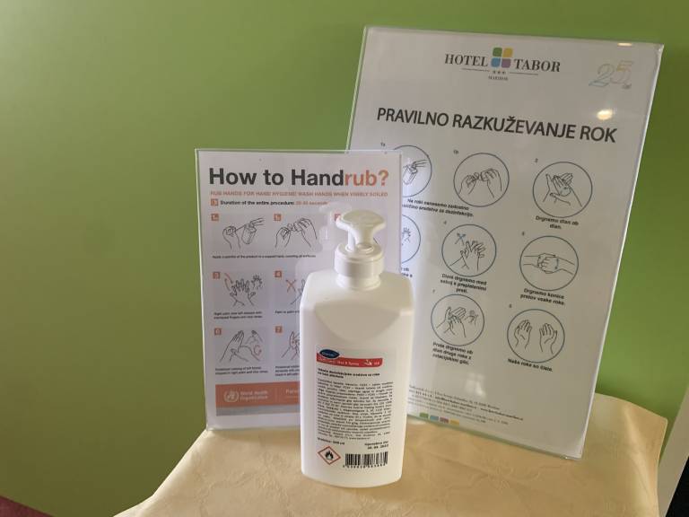 Preverjanje telesne temperature s posebno kamero, zaščitna maska in razkužilo za dobrodošlico