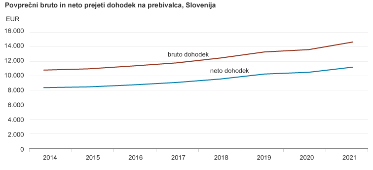 Povprečni letni prejeti neto dohodek na prebivalca Slovenije je bil v 2021 nominalno za sedem, realno pa za pet odstotkov višji kot leto prej.