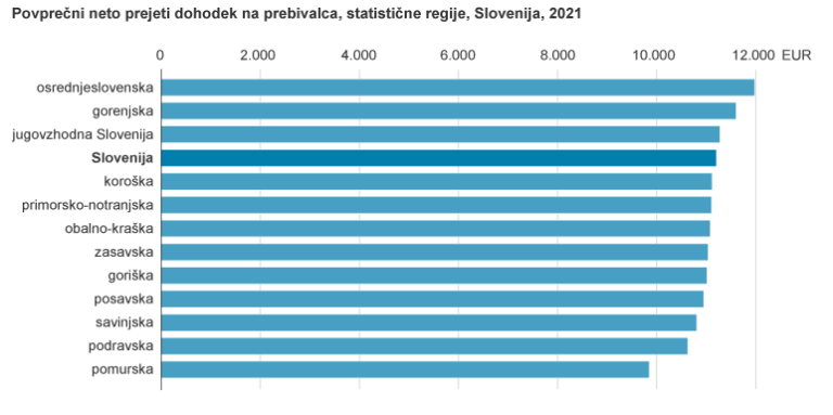 Na ravni statističnih regij je bil v opazovanem letu 2021 povprečni neto dohodek na prebivalca najnižji v pomurski, kjer je znašal 9847 evrov in je bil za 12 odstotkov nižji od slovenskega povprečja. Takoj za pomursko, pa se po povprečnem neto dohodku nahaja Podravska regija.