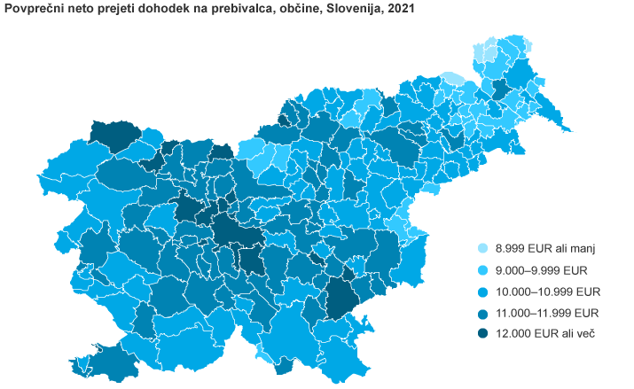 Povprečni neto dohodek na prebivalca je bil v 2021 najvišji v občini Kranjska Gora, kjer je znašal 15.346 evrov in bil za kar 37 odstotkov višji od slovenskega povprečja.