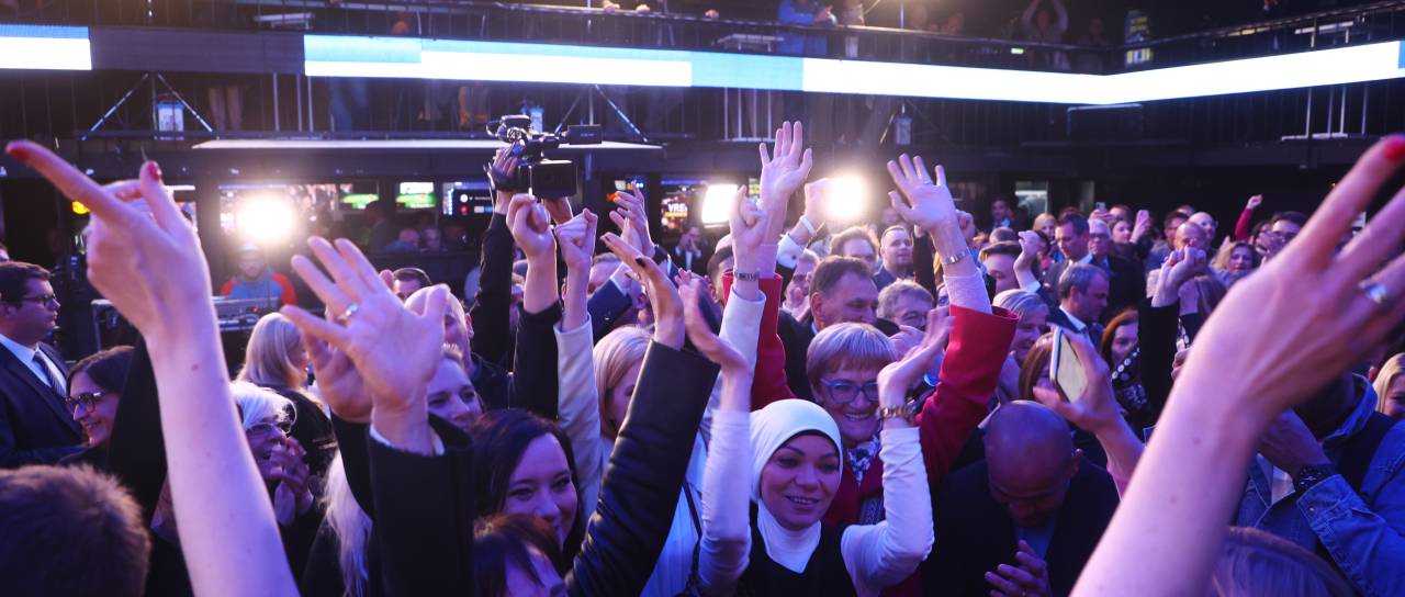 V volilnem štabu v polni Cvetličarni so si člani in simpatizerji stran že pred zaprtjem volišč v pričakovanju dobrega volilnega izida čestitali.