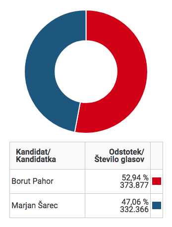 Borut Pahor je po delnih neuradnih izidih glasovanja dobil 52,94 odstotkov glasov, 47,06 odstotkov pa Marjan Šarec.