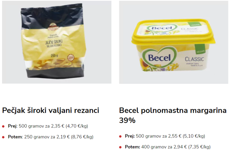 V Zvezi potrošnikov Slovenije so največjo spremembo količine opazili pri izdelku Pečjak jajčni široki valjani rezanci, saj se je pakiranje prepolovilo s 500 gramov na 250 gramov.