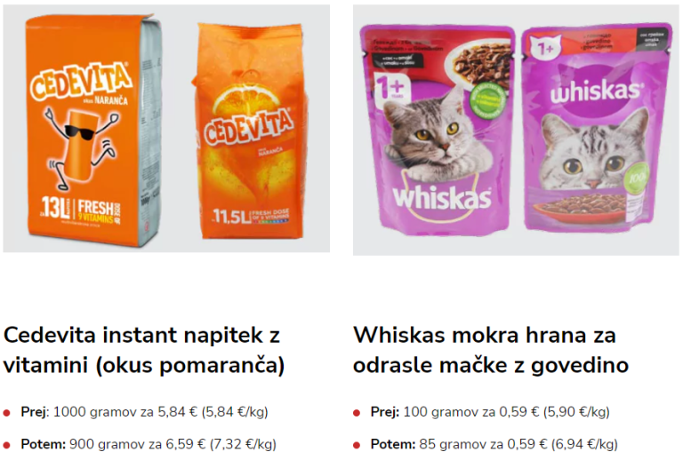 Takšen primer so v Zvezi potrošnikov Slovenije zaznali tudi pri nas. Tako poročajo, da je izdelek Whiskas mokra hrana za odrasle mačke pred kratkim sicer doživel manjšo oblikovno prenovo, velikost, oblika vrečke in prodajna cena izdelka pa so ostali nespremenjeni. Vendar pa se je količina izdelka s 100 zmanjšala na 85 gramov.
