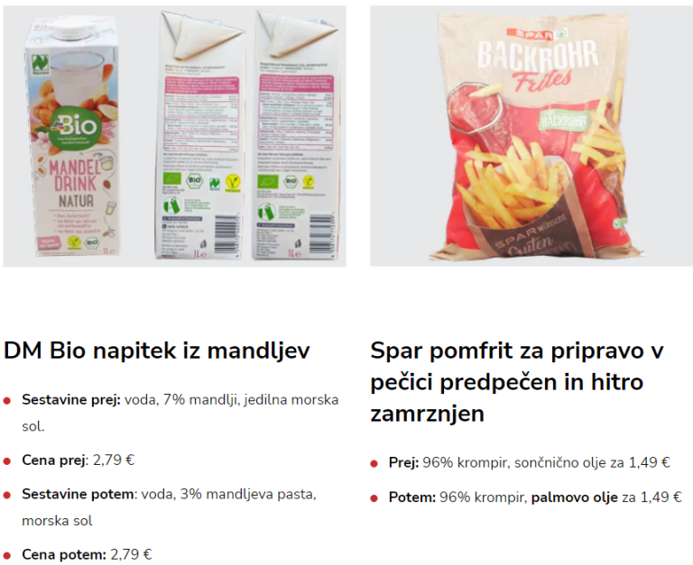 Pri nas je Zveza potrošnikov Slovenije takšno prakso opazila pri treh izdelkih, ki so jim spremenili recepturo. Tako DM bio napitek iz mandljev, ki je prej vseboval sedem odstotkov mandljev, danes vsebuje le tri odstotke mandljeve paste. O zmanjšanju vsebnosti mandljev priča tudi podatek o nižji energijski in hranilni vrednosti novega napitka.