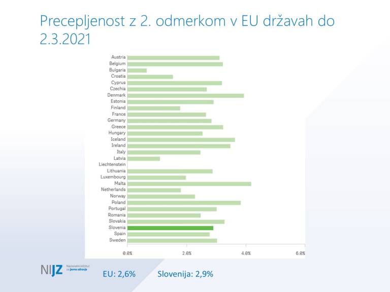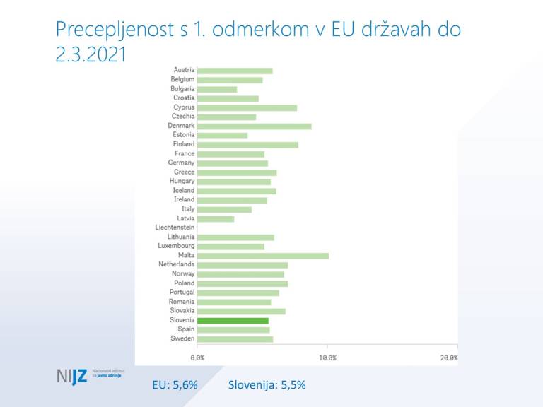Precepljenost s prvim odmerkom v Sloveniji je blizu povprečja Evropske unije, precepljenost z drugim odmerkom pa je nad povprečjem Evropske unije.