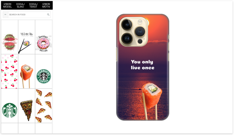 Svoji končni obliki ovitka za telefon pa lahko dodate enega od motivov, ki so zbrani v posebnih kategorijah. Izbirate lahko med motivi risank, rož, živali, hrane in še mnogo drugega, prav tako pa ne spreglejte raznih citatov, ki jih lahko uporabite namesto dodajanja lastnega teksta.