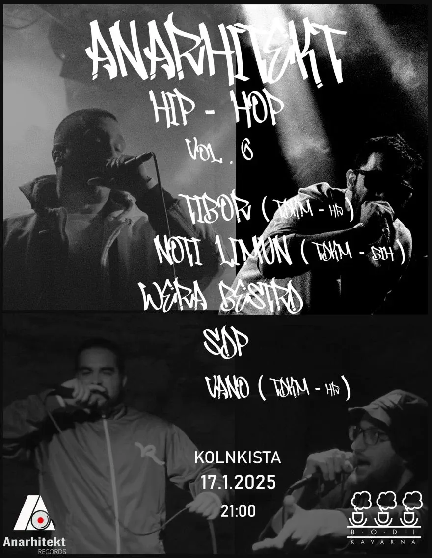 Ob 21. uri bo v MKC Kolnkišta glasbeni spektakel Anarhitekt Hip Hop Vol. 6, kjer bodo nastopili Tibor (HR), Noti Limun (BIH), Wera Bestrd, SDP in Vano (HR).