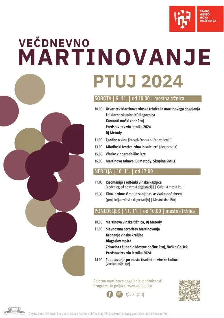 Ob 11. uri bo na Mestnem trgu organizirano tematsko turistično vodenje Zgodbe o vinu, ki bo popestreno z lokalnimi zgodbami in tradicijo. Dogodki v sklopu martinovanja se bodo odvijali tudi v nedeljo in ponedeljek.