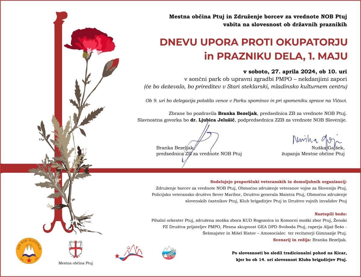 Mestna občina Ptuj in Združenje borcev za vrednote NOB Ptuj vabita na slovesnost ob državnih praznikih Dnevu upora proti okupatorju in prazniku dela, 1. maju v soboto, 27. aprila, ob 10. uri v Sončni park. V primeru dežja bo prireditev v Stari steklarski.
