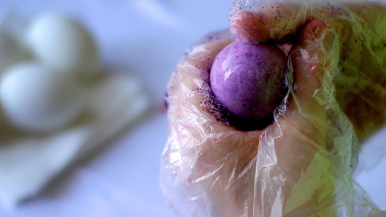 V obarvan riž položimo po eno kuhano jajce in vrečko nežno stresamo, dokler se barva ne oprime lupine. Če želimo večbarvni učinek, lahko isto jajce prestavimo še v drugo vrečko z drugo barvo in postopek ponovimo.